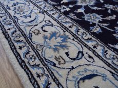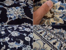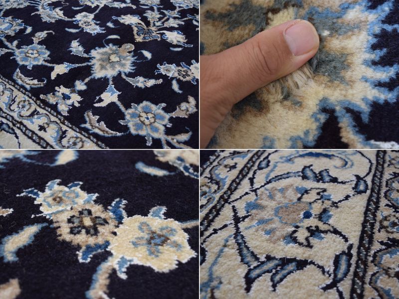 イラン・タバス産のペルシャ絨毯です。 新品未使用のお品です。 ダークネイビーのベースカラーに王道のデザインが映えます。 簡単に捲れる事のないしっかりとした織り地に毛足を携えた肉感ある1枚です。 約2mx2mの正方形スクエアタイプのサイズ感は、ソファの足元に良い相性です。 -------- 【見た目に、、、】 見た目にも肉厚な絨毯です。 2m×2mの正方形スクエアタイプの絨毯で、センターテーブル等を置いても非常に安定するしっかりとした織り地です。 マットな見た目の印象のある毛足で、角度によってクリーミーな色合いから光が反射して輝くような色合いへと印象を変えます。 -------- 【触り心地は、、、】 簡単には捲れる事のないしっかりとした織り地に肉感ある毛足を携えています。 面で触るともちっとした低反発感ある弾力を感じる織り地です。 毛足に沿って撫でるともこもことした肉厚な手触りです。 ふかふかとした触り心地はウールに包み込まれるようでとても安心感を与えてくれます。 簡単に捲れることのないしっかりとしたベースの織り地です。 みっしりと詰まった肉感を感じ、ふわふわとした毛足の肉感を感じます。 柔らかな肉感と共に床面の感触が身体に伝わり、包み込まれるような安心感ある優しい感触を味わえます。 -------- 【状態詳細は、、、】 新品未使用のウール手織り絨毯です。 日本で一般的に流通している9la規格のものよりも経糸が太い糸で織られている12la規格のナイン絨毯に近い織です。 しっかりと太めのコットン糸にペルシャ結びで織られた織り地はみっちりと引き締まっていて、厚手でしっかりとした織りの絨毯です。 絨毯全体の毛足は、ふかふかとした毛足が密集して、きめ細かです。 約1.2cm程度の毛足は見た目にも肉厚な立ち上がりの毛足です。 白やベージュ、ダークネイビーを基調とした色合いやふわふわとした柔らかなウールの良質さが際立ち、絨毯全体の印象を優しいものにしています。 -------- 【サイズ感は、、、】 約4㎡・〜3帖程度のサイズ感で、正方形のスクエアタイプです。 リビングルームでは、コーナーソファの中心に最適です。 ダイニングテーブルや客室の足元に敷いてお部屋をくつろぎの空間に変えてくれます。 クラシックな王道デザインは畳とも良い相性で、和室や日本家屋にも良い相性です。 ホテルや旅館、ペンション等の人の集まる、お客様をおもてなしする場にも相応しい上品な美しさを兼ね備えた1枚です。 良いラグはあなたの空間を特別なものに変えてくれます。 -------- ***デザインやカラーリングについて*** ◆全体のデザイン◆ 主にナイン絨毯のデザインを生産するタバスならではのアラベスク模様の美しい正統派な王道デザインです。 正方形に近いサイズ感が、中央の花々をより際立たせてくれています。 優しい色合いの中、余白を上手に使い花々が美しく咲き乱れるデザインです。 こちらの絨毯は総柄デザインの『オールオーバー』デザインです。 絨毯の中央に小花をあしらい、それを中心にアラベスク調の花模様が活き活きと描かれています。 バラやユリの断面をデザインしたシャーアッバス模様をあしらった、花や樹木を扱った花柄のアラベスク調の王道デザインです。 ナインならではの白系と青系の統一された色合いと、緻密な花模様が美しい王道の落ち着いたデザインです。 ユリやダリヤの断面を描いたシャーアッバス模様の花々がきめ細かな毛足に美しく描かれています。 ◆全体のカラーリング◆ フィールド全体に使用された生成り色がかった白と黒にも近い印象のダークネイビーがベースカラーとなっています。 生成り、ベージュ、淡いブルーやネイビー、グレーを多用する色合いは上品かつ、落ち着いた印象を与えてくれるとても優しい色合いです。 中央のメダリオン、フィールド、ボーダーもこの色合いで統一され、縁取りや差し色にネイビーや水色、青の系統の色合いが使用され、ダークネイビーのベースカラーに浮き上がるようです。 王道のデザインが優しい色合いを際立たせ、絨毯全体に落ち着いた印象を与えます。 光の当たり具合によって白く反射して輝く様なホワイトからまろやかでクリーミーなアイボリーの色合いにパイルの表情が美しく変化します。 毛足の流れに日差しが当たることや、見る向きや角度によって見え方が美しく変わります。 日差し、影、部屋の電気、間接照明など、朝、昼、夜で違った顔を見せてくれるところも素晴らしいところです。