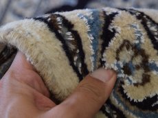 全体に統一されたまるで雪の様な色合いと、淡い色合いを使用して織り上げられたデザインは、そのデザインだけでなく、配色に統一性があり、一見華やかなデザインはまとまりがあり、トゥーマッチな印象は与えません。 毛足の流れがあることにより、日差しや明かり、見る角度による見え方の違いが楽しめます。 淡く優しい色合いは、日中と夜の見え方の違いがとても面白く、昼間は日差しの反射で艶々と反射して見えるような見た目が、夜は間接照明などでより深く、落ち着いた佇まいを見せてくれます。 日々の暮らしの中で美しさに対する気づきをもたらしてくれます。 ***手触りやコンディションについて*** ◆全体のコンディション◆ 新品未使用のお品です。 約1.2cm程度の毛足で、毛足は新品ならではの立ち上がりで、もっちりとした弾力があります。 全体の毛足の立ち上がりにはややムラ感を感じます。 しっかりと織られた織り地は、美しい模様と優しい色合いを際立たせ、日差しや照明の影響で、白っぽく輝く様な見た目から、まろやかでクリーミーな印象に表情を変えます。 絨毯の裏を見ると、織り込まれた編目は細かくしっかりと密に並んでおります。 しっかりとコットンのたて糸に織り詰められた毛足は短くも腰があり、密集してしっかりとした手ごたえがあります。 遠目にわかりませんが、約1cm程度の補修跡が複数箇所にございます。使用には問題ございません。 暮らしの中で年月と共に深まる風合いをお楽しみください。