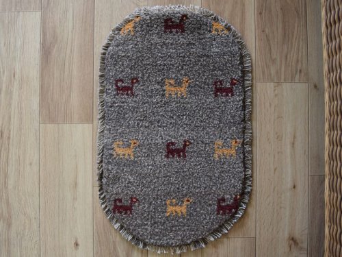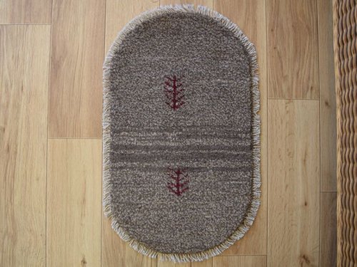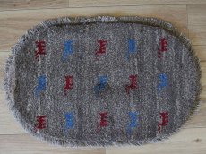 イラン・シラーズで作られたハンドメイドギャッベです。 植物、草木や実などを主にした自然由来の素材で染色するギャッベはまさに自然界からの贈り物です。 あたたかみを感じるハンドメイドの風合いは、敷いてあるだけでお部屋とこころに彩りを与えます。 自然由来の染料で肌に優しく、長い毛足がふかふかとしてソフトな手触りです。 味わい深いのハンドメイドのペルシャギャッベです。 ----- 【見た目に、、、】 ぐるりとギャッベをフリンジ(房)が囲む小判型のギャッベです。 ギャベならではのふかふかとした柔らかな羊毛毛足(ウールパイル)が立ち上がり良く並び、見た目にも毛足の肉感を感じます。 ミニギャッベのフィールドには、全体に赤と青のウールで家内安全を願う動物のモチーフがちりばめられたシンプルなデザインです。 近めに見るとマットな質感を感じる毛足です。 優しい色合いとカラフルなシンボルたちに彩られた毛足は、光の当たり具合によって鮮やかな色合いをより美しくその表情を変えてくれます。 ----- 【触り心地は、、、】 絨毯全体の毛足は、ふわりとした羊毛の1本1本が密集して立ち上がっています。 持ち上げるとくにゃりとする織地に、やや毛羽立つ様な1本1本がふわふわとした毛足で、面で触るとウールパイルに深く沈み込み、ふかふかとした肉感と毛足のもちもちとした低反発感ある弾力とのある触り心地で、やわらかく長い毛足に包みこまれる様です。 絨毯を足で踏みしめた際には、もっちりとした弾力あるパイルに沈む感触を味わうことのできる1枚です。 やや毛流れに傾き揃った毛足を毛流れ方向に沿って撫でるとふわふわとしたウールの柔らかな手触り。 やや毛羽立つ様な、均一な長さで揃えられた長い毛足は、1.5cm程度と肉厚な立ち上がりで、やや毛羽立つ様な味のある不揃い感があり素朴な印象です。 持ち上げるとみっしりと詰まった分厚い毛足の重厚な肉感を感じる織り地です。 ----- 【状態詳細は、、、】 見た目はふかふかですが、寒暖の差が激しいイラン南部に暮らす遊牧民が昔から織って使ってきた敷物ですので、夏でも快適に過ごせます。 2cm程の厚みのわりに通気性があり、ホットカーペットの上に敷いても、ほんわかと心地よい暖かさが伝わってきます。 ギャッベの外周を囲むフリンジ房はウールで結ばれています。 新品未使用のギャッベで、あなたの暮らしの営みと共に時間を歩む事の出来る、これから長くご使用いただけるお品です。 ふかふかした毛足(パイル)で、手触りが気持ちいい手織りのギャッベ。 草木染の色あいと素朴であたたかみのある手織りのじゅうたんで、 暮らしを明るく彩ります。 手織りならではの一枚一枚違ったテイストをお楽しみください。 ----- 【サイズ感は、、、】 ふかふかした毛足で、手触りが気持ちいい楕円形・約60×40cm程度のサイズ感の手織りのギャッベ。 マンションなどの玄関マットとして、またベンチスツールの座布団、椅子の足元などに使えるサイズです。 仕事机や勉強机の下の開いたスペースに置くと、足元があたたかくすごせます。 プレゼントにも是非どうぞ。 ミニマットサイズは、玄関マットやベンチスツールの座布団、椅子や姿見の足元や、勝手口等マルチに活躍します。 お仕事机や勉強机の下に敷いて、足元に包まれる様なウールの安心感を与えてくれます。 取り回し易いサイズ感は気分によって敷き替えをしたり、暮らしの中で様々な表情を見せてくれます。 良いラグはあなたの空間を特別なものに変えてくれます。 ----- ***デザインやカラーリングについて*** ◆全体のデザイン◆ ギャッベならではの素朴なデザインで、遊牧民のシンボルモチーフがフィールドにシンプルに配されたデザインです。 シンプルなデザインはインテリアの雰囲気をより良いものにしてくれます。 絨毯をぐるりと囲む様にフリンジ(房)が囲む小判型のデザインです。