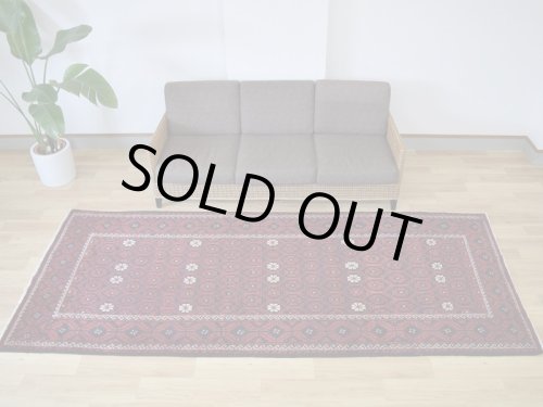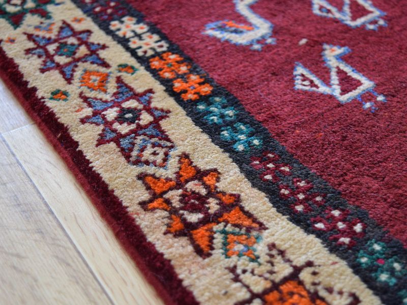 トランジの縁取りにはランニングドッグ(走る犬)柄と呼ばれる鈎型の犬の歯を模した文様が配されており、家内安全の意味合いを持っています。 抽象化された模様は犬の形を成していませんが、一般的に古代から動物のモチーフには守護の意味合いが多くみられ、外敵から生活を守るといった意味合いが伺えます。 ◇フィールド◇ 余白を大きくとったフィールドは、ワインレッドを感じるエンジ色がベースカラーとなっています。 遠目にツヤ感を感じ、日差しや照明の表情変化で明るい印象を与えます。 菱形のトランジのそれぞれの中央に配された大きなメダリオンや遊牧民のシンボルが散りばめられたデザインです。