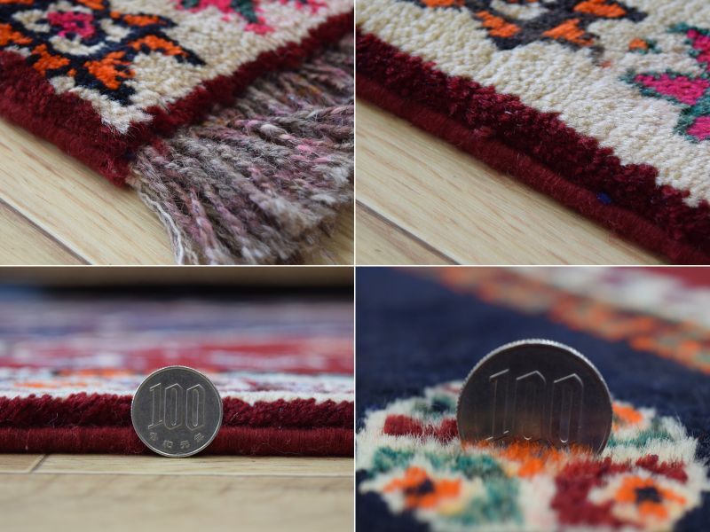 ***手触りやコンディションについて*** ◆全体のコンディション◆ 約46年〜程度の経年のお品ですが、豊富な毛足はキメ細かくみっしりと詰まって均一で肉感があります。 しっかりと織られた簡単に捲れる事のない織り地です。持ち上げるとずっしりとした密に詰まった織り地を感じます。 約1.5cm程度の毛足は、しっかりと引き締まった織り地のベースで、1本1本がふわりと柔らかな毛足を携えて捲れにくく安定感があります。 持ち上げるとずっしりとした肉感ある織り地の重量感があります。 ウールパイルの色合いは、経年のムラ感ある色合いの変化やニジミ感を見せて味わい深い印象です。 色合いの変化のある箇所等についても豊富な毛足で、毛足がかすれて穴になっている等のダメージではありません。 絨毯の裏を見ると、織り込まれた編目はみっちりと正方形で密に並んでおります。 みっしりと密に並ぶしっかりとした均一で密な織りです。 毛足やセルビッチ(大外の縁取り)の大きなダメージも見受けられず、状態の良い良品です。