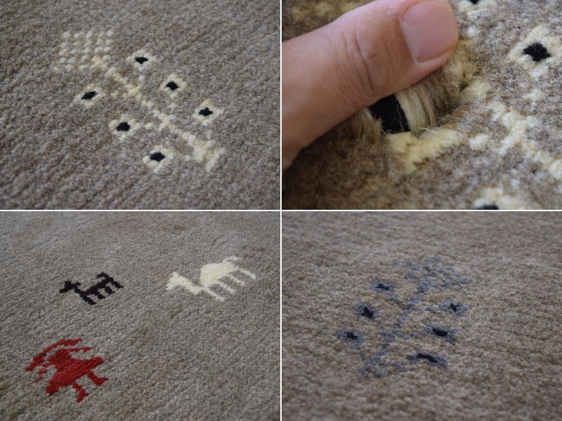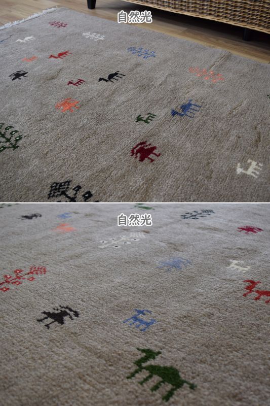 リビングルームやダイニングルーム、客室、寝室を特別なくつろぎの空間にする、 味わい深いのハンドメイドのペルシャギャッベです。 ----- 【見た目に、、、】 分厚い毛足が立ち上がり、見た目にも肉厚です。 ギャベならではのふかふかとした柔らかな毛足が毛流れ方向にやや傾く様に並び肉感を感じます。 ライトグレーのウール毛足にやや茶の濃淡のある毛足がベースカラーとなっています。 ややベージュを感じさせる色合いです。 健康長寿を願う生命の樹のモチーフや、家内安全の願いを表す動物のモチーフがギャベのフィールド全体にちりばめられています。 近めに見るとマットな質感を感じる毛足です。 ----- 【触り心地は、、、】 持ち上げるとくにゃりとする柔らかな織り地で、ウールが詰まっている肉厚な感触を感じます。 1本1本がふわふわとした毛足で、面で触るとウールに深く沈み込み、ふかふかとした肉感と毛足のもちもちとした低反発感ある弾力を感じる触り心地で、やわらかく長い毛足に包みこまれる様です。 絨毯を足で踏みしめたり腰かけた際には、もっちりとした弾力あるパイルに沈む感触を味わうことのできる1枚です。 やや毛流れに傾き揃った毛足を毛流れ方向に沿って撫でるとふわふわとしたウールの柔らかな手触り。 持ち上げるとみっしりと詰まった分厚い毛足の肉感を感じる織り地です。 ----- 【状態詳細は、、、】 絨毯全体の毛足は、ふわりとした羊毛の1本1本が密集して立ち上がっています。 毛足表面は均一に整えられています。 均一に並んだ表地の毛足は、1.8cm程度と肉厚で、立ち上がりで、見た目にもふわふわとした印象です。 しっかりとした織り地のベースの絨毯の裏を見ると、織り込まれた編目は均一でみっちりと密に並んでいます。 優しい色合いとカラフルなシンボルたちに彩られた毛足は、光の当たり具合によって鮮やかな色合いをより美しくその表情を変えてくれます。 フリンジ房はウールで結ばれています。 新品未使用のギャッベで、あなたの暮らしの営みと共に時間を歩む事の出来る、これから長くご使用いただけるお品です。 ----- 【サイズ感は、、、】 ソファとTVの間等、リビングルームに敷くのにぴったりのサイズです。 2〜3人掛けのソファーの前に敷いて、ローテーブルを置くことの出来るサイズです。 ソファーの前に座って皆で団らんが出来るサイズ感です。 ダイニングルームや寝室、子供部屋や趣味の部屋にもアクセントとして活躍します。 寝室ではベッドサイドに敷くことで、1日の始まり、1日の終わりを特別な気持ちで過ごすことが出来ます。 手織りウールは冬あたたかく、夏はさらりとした質感で通年敷いていただけます。 天然ウールのやさしさをたっぷり楽しめる贅沢なサイズです。 良いラグはあなたの空間を特別なものに変えてくれます。 ----- ***デザインやカラーリングについて*** ◆全体のデザイン◆ ギャッベならではのシンプルなデザインです。 ギャッベ絨毯のフィールド全体に、健康長寿を願う生命の樹や家内安全を願う鹿等の沢山の遊牧民のシンボルモチーフが散りばめられています。 ----- ◆全体のカラーリング◆ 天然由来の染料で染められた淡い優しい色合いのウールをふんだんに使用した、ライトグレーの色合いをベースにした1枚。 やや茶色がかったウールの混ざるベージュ系の色合いです。 ちりばめられた遊牧民のシンボルたちはカラフルかつ落ち着きある色合いでデザインされています。 優しく落ち着いた印象があり、全体のまろやかな色合いとポップさを感じさせるシンボルたちが明るさと落ち着きの両方の印象を与えてくれます。 シンプルなデザインはインテリアの雰囲気をより良いものにしてくれます。 全体に近め見るとにマットな印象を与える毛足のツヤ感です。 やわらかで味わい深い毛足の流れに日差しが当たることや、見る向きや角度によって見え方が白っぽく反射する様な色合いからまろやかな深みある色合いへと美しく変わります。 照明や日差し、見る角度によって白っぽく反射する様な色合いから、深みある濃い色合いに表情を変化させます。 毛足に流れがあることにより見え方の違いが楽しめます。 日中と夜の見え方の違いがとても面白く、昼間は日差しの反射で艶々と反射して見えるような見た目が、夜は間接照明などでより深く、落ち着いた佇まいを見せてくれます。 日差し、影、部屋の電気、間接照明など、朝、昼、夜で違った顔を見せてくれるところも素晴らしいところです。 日々の暮らしの中で美しさに対する気づきをもたらしてくれます。 暮らしの中で年月と共に深まる風合いをお楽しみください。 *** ギャッベには毛の流れがあり、一方向に羊毛が若干”ねている”様になっています。 大きなサイズのギャベになりますと、毛の流れに光が反射して、光の当たる方向によって、見え方も若干変化してまいります。 日光と共に表情を変える天然ウールの絨毯の毛並みを楽しめるの