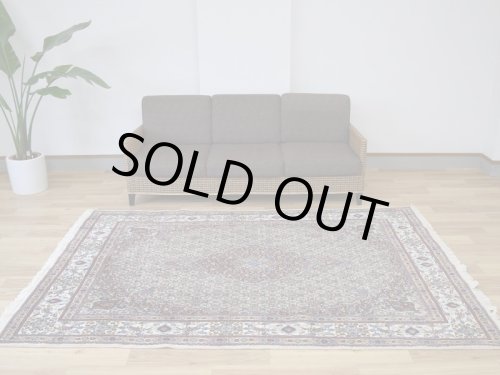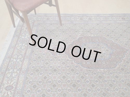 ***手触りやコンディションについて*** ◆全体のコンディション◆ 20年程度の経年のお品ですが、密集してコシのある豊富な毛足はキメ細かくみっしりと詰まって均一で、良質な毛足の立ち上がりです。密に詰まった毛足がお互いを毛流れ方向に支え、均一できめ細かな立ち上がりを見せています。 約0.8cm程度の毛足はみっしりと弾力を感じる肉感の立ち上がりです。 絨毯の隅を持ち上げるとくにゃりとする柔らかな織り地ですが、ふわりとした柔らかな毛足の確かな肉感を感じます。 しっかりと引き締まったベースの織り地に柔らかな毛足を携えて捲れにくく安定感があります。 絨毯の裏を見ると、織り込まれた編目はみっちりと正方形で密に並んでおります。 しっかりとした均一で密な織りです。 毛足やセルビッチ(大外の縁取り)の大きなダメージも見受けられず、状態の良い美品です。 画像・遠目にはではわかりずらいですが、絨毯右上のフリンジの数本に染料ニジミ・汚れがございます。使用に問題はございません。