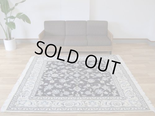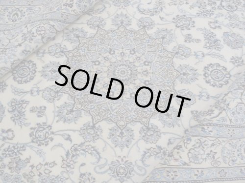 -------- ***デザインやカラーリングについて*** ◆全体のデザイン◆ クム、イスファハーン、タブリーズ、カシャーンと並ぶペルシャ絨毯の5大生産地として知られてるナイン絨毯。 ナイン絨毯ならではのアラベスク模様の美しい正統派な王道デザインです。 こちらの絨毯は中央にメダリオンを配した『トランジ』デザインです。 中央にメダリオンをフィールドの四隅にコーナーメダリオンを配していることから『メダリオンコーナー』デザインとも呼ばれます。 バラやユリの断面をデザインしたシャーアッバス模様をあしらった、花や樹木を扱った花柄のアラベスク調の王道デザインです。 ナインならではの淡くクリーミーにの統一された色合いと、緻密な花模様が美しい王道の落ち着いたデザインです。 ユリやダリヤの断面を描いたシャーアッバス模様の花々がきめ細かな毛足に美しく描かれています。 ◆全体のカラーリング◆ 絨毯全体に使用されたウールの優しい印象を与えるクリーミーな生成り色と、フィールドに使用されたモスグリーン・エメラルドグリーンがベースカラーとなっています。 全体に淡く優しい色合いが統一して使用され、王道のデザインと合わさってとても落ち着いた印象です。 花々等の模様にもベースカラーの同系色が多用され、統一された色合いを使うことで絨毯全体にも統一感を与えています。 キメ細かくふわりとした柔らかなウールの毛足にまろやかな色合いが染色され、やさしくクリーミーな色合いの印象を与えています。 それぞれの色合いがクリーミーな印象を与え、王道デザインに色合いのコントラストがとても美しい絨毯です。 力強い縁取りが使用され、活き活きとした花々の模様を際立たせています。 経年品ではありますが、カスレ色落ち等の印象は感じません。