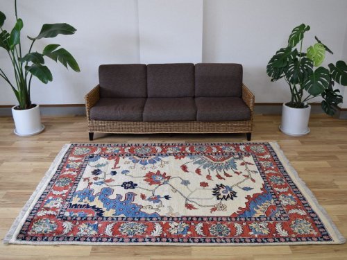 ペルシャ絨毯には毛の流れがあり、一方向に羊毛が若干”ねている”様になっています。 大きなサイズのペルシャ絨毯になりますと、毛の流れに光が反射して、光の当たる方向によって、見え方も若干変化してまいります。 日光と共に表情を変える天然ウールの絨毯の毛並みを楽しめるのも大きなサイズならではです。 *** ペルシャ絨毯は日本の家屋ともよい相性で、日本家屋や古い和箪笥等の和の装いを纏った空間にも適しております。 大きなサイズでお部屋に敷く際には、お部屋の印象を上品で美しく変えてくれます。 ホテルや旅館、ペンション等のお客様をおもてなしする空間にも最適な絨毯です。 リビングルームでは2〜3人掛けのカウチソファーの前に敷きテーブルを置くことのできるサイズです。 コーナーソファの中心に最適です。 ダイニングルームでテーブル下に敷いて、食卓を明るくしてくれます。 寝室に敷くことで1日の始まり、1日の終わりを特別な気持ちで過ごすことが出来ます。 客室等、特別な空間に敷くことで絵画の様に空間を素敵な雰囲気に変えてくれます。 書斎のデスクの足元や音楽スペースなど、自分だけの特別な空間に敷くのも気持ちの良いものです。 ペルシャ絨毯の緻密なデザインを楽しみつつ、天然ウールのやさしさをたっぷり楽しめます。 床に絵を飾っている様に、毎日過ごすお部屋を素敵な空間にしてくれます。 お部屋のアクセントに是非どうぞ。 味のある家具やアンティークインテリア、コーヒーテーブル等と良い相性です。 お家のフローリング、カフェ、アパレルセレクトショップやヘアサロン内装等、多くの用途にご使用いただけます。 |